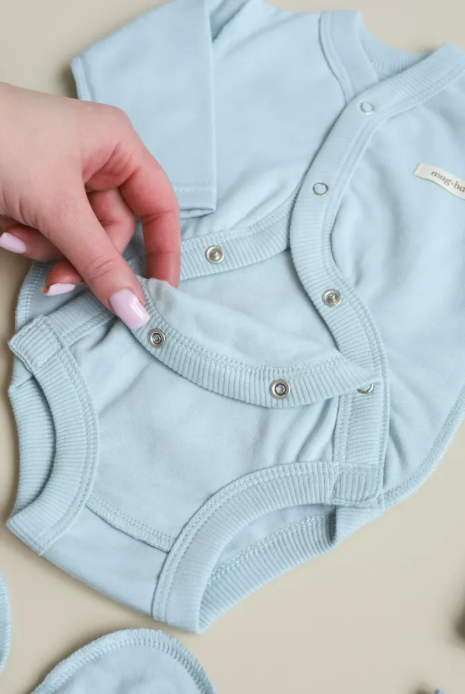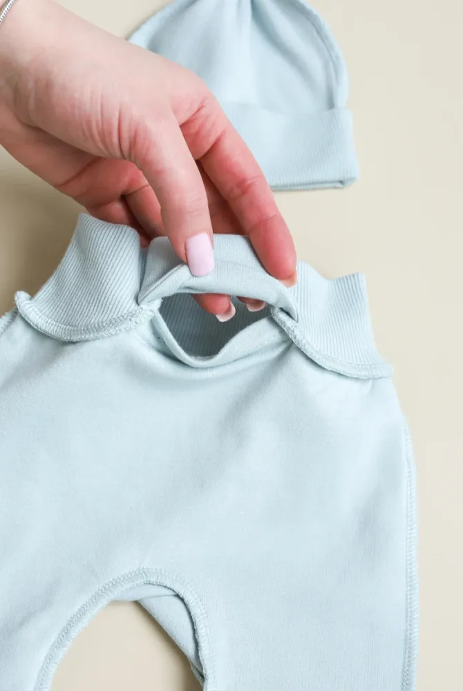 Комплект має конструктивно продуманий легкий доступ до пупкової ранки. Тканина не тисне і не заважає загоєнню, дозволяє ранці контактувати з повітрям та сприяє швидшому відновленню. Після загоєння речі можна використовувати як звичайний повсякденний одяг.