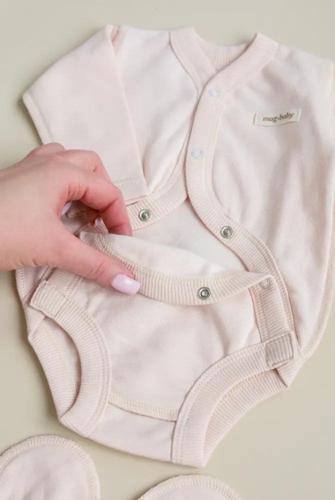 Комплект має конструктивно продуманий легкий доступ до пупкової ранки. Тканина не тисне і не заважає загоєнню, дозволяє ранці контактувати з повітрям та сприяє швидшому відновленню. Після загоєння речі можна використовувати як звичайний повсякденний одяг.