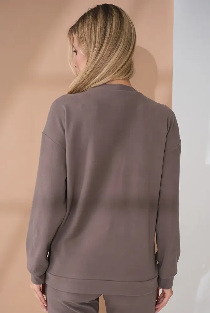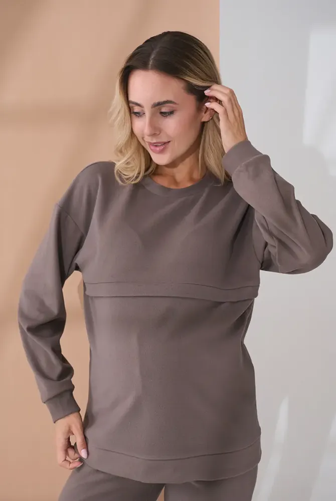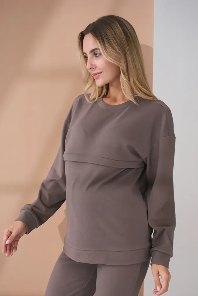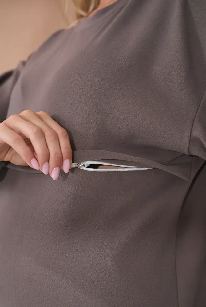 Свитшот свободного силуэта, не сковывающий движений и имеющий достаточное пространство для роста животика. Для удобства при кормлении предусмотрена горизонтальная потайная молния с двумя бегунками — быстрый и незаметный доступ, когда это нужно.