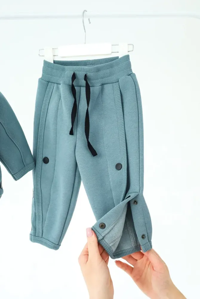 Кофта застегивается на молнию, что позволяет легко регулировать комфорт в зависимости от погоды. Декоративные швы и кнопки по бокам придают образу трендовости. Кстати, кнопки функциональны – можно расстегивать для удобства или создания модного силуэта. Брюки имеют широкий эластичный пояс с резинкой, обеспечивающий комфортную посадку без давления на живот.