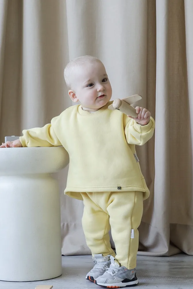 Комплект изготовлен из плотной тринитки на флисе — именно этот материал отлично сохраняет тепло, не раздражает чувствительную кожу и дарит невероятно приятные тактильные ощущения. Костюм не «кусается», не парит и не теряет форму даже после множества стирок.