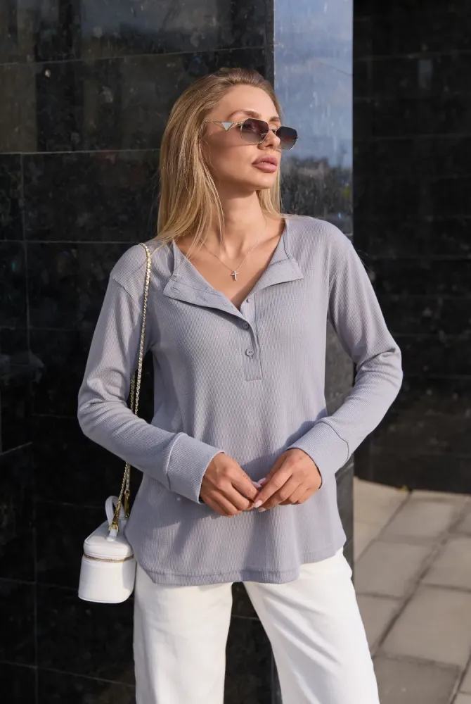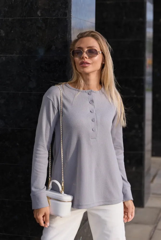 Уютный лонгслив Kalgary для беременных и кормящих мам. Модель имеет свободный крой для максимального комфорта на любом сроке беременности, а глубокая планка пуговиц – для удобного и незаметного кормления.