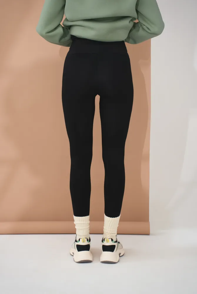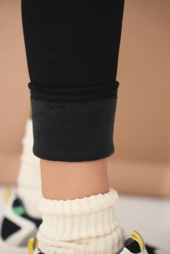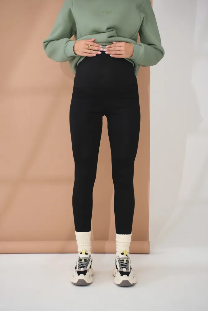 Плотная, но эластичная ткань с мягким тёплым мехом внутри обеспечивает ощущение уюта и защищает от холода, не создавая лишнего объёма. Высокий пояс мягко поддерживает животик, не сдавливает и адаптируется к изменению фигуры на всех этапах беременности.